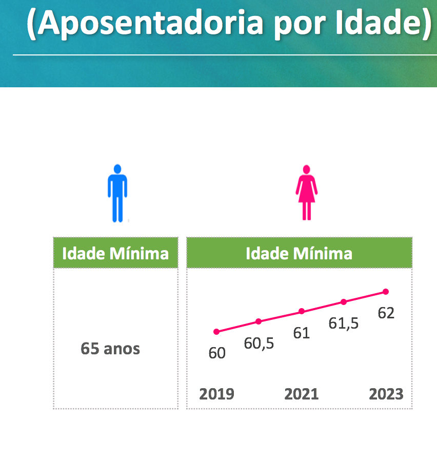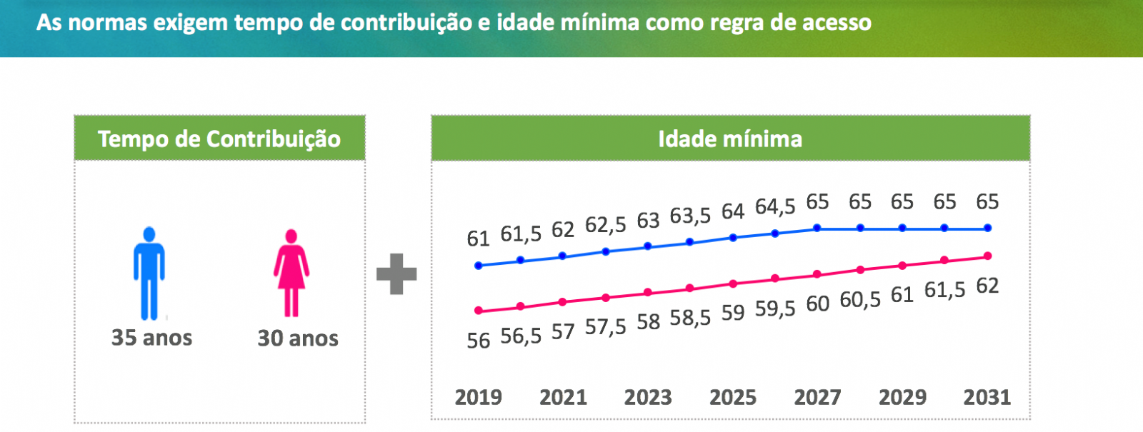 Nessa regra, a cada ano, haverá o acréscimo de 6 meses na idade mínima exigida, até atingir 62 anos para a mulher e 65 anos de idade para o homem, conforme tabela abaixo: