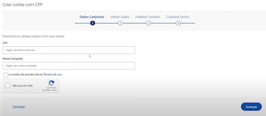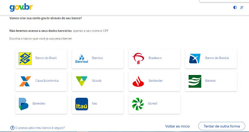 Após, você será direcionado para realizar o cadastro por meio do seu Banco, clique na opção TENTAR DE OUTRA FORMA, até chegar na próxima tela: