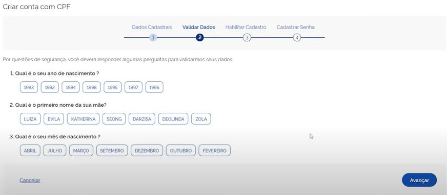 Passo 4: Agora será necessário VALIDAR os seus dados. Marque o ano do seu nascimento, o primeiro nome da sua mãe e o mês de nascimento.