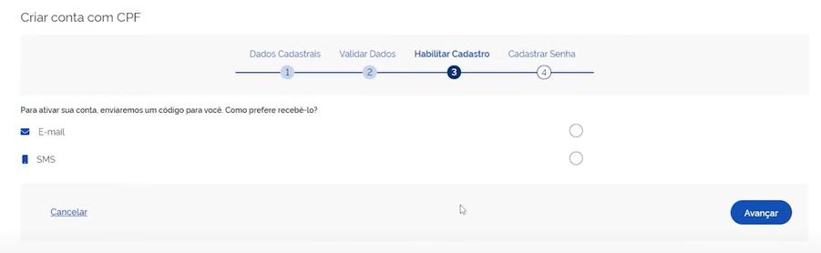 Passo 5: Será necessário HABILITAR o cadastro. Para tanto informe um número de telefone ou e-mail para receber um código do GOV.BR.