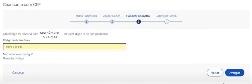 Passo 6: Caso você não receba o código, clique em reenviar código. Se ainda tiver dificuldade, clique na opção voltar e informe outro e-mail ou outro número de telefone.