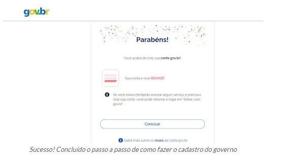 Passo 8: Por fim, aparecerá uma mensagem de “Parabéns” especificando o nível da sua conta. Clique no botão “Concluir” e pronto! Seu cadastro estará finalizado com sucesso e você acaba de criar conta gov.br para utilizar os serviços oferecidos.