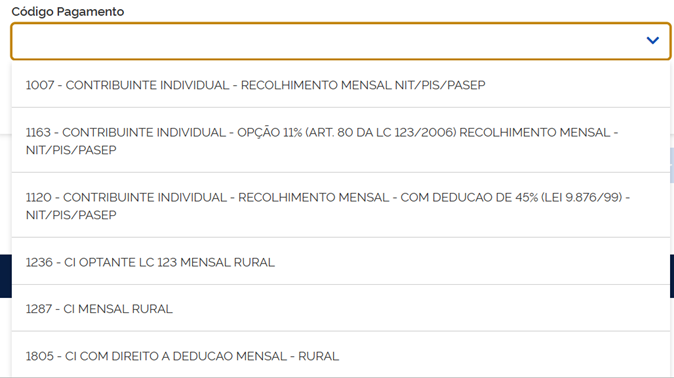 | 1244 | Contribuinte Individual – Rural Mensal – Complementação 9% (para plano normal) |