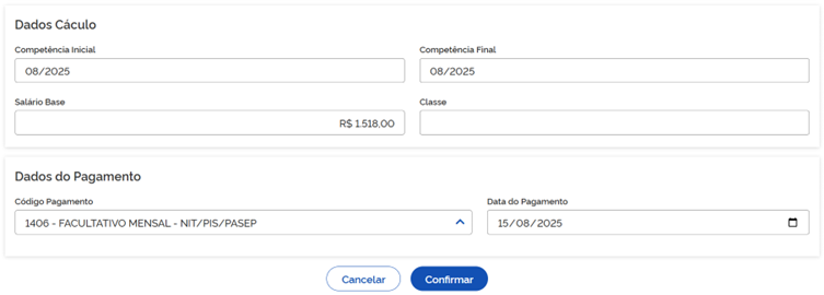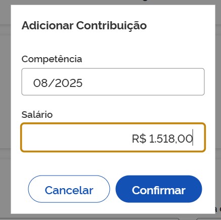 Exemplo prático: Se você deseja contribuir pelo salário mínimo referente ao mês de agosto de 2025, deve preencher o campo “competência” com 08/2025 e informar R$ 1.518,00 no campo “salário de contribuição”, que é o valor do salário mínimo vigente em 2025.