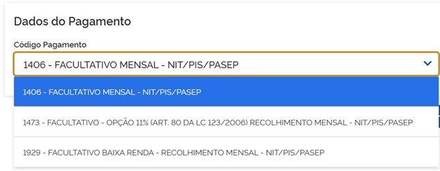 | 1821 | Facultativo / Exercente de Mandato Eletivo / Recolhimento Complementar |